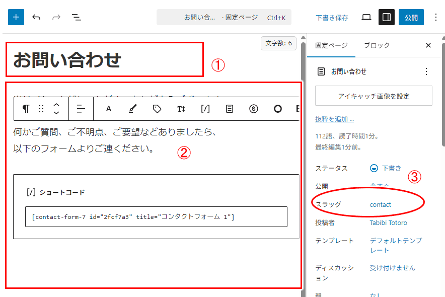 関連:お問い合わせフォームの作り方!プラグインで簡単設置! - ③:URLスラッグは contact や email 等