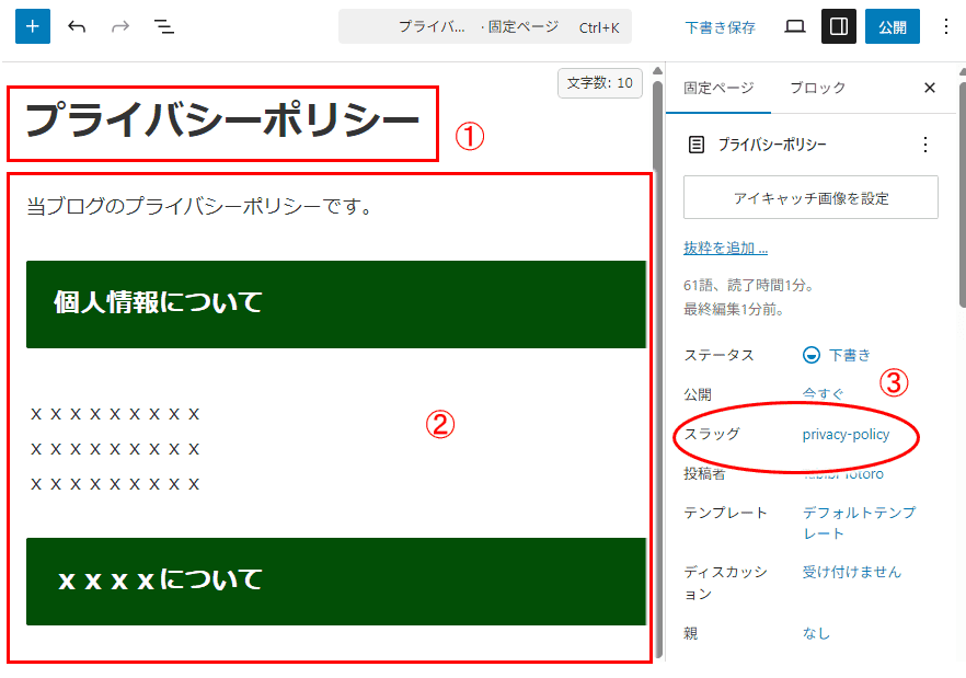 関連:プライバシーポリシーの書き方とテンプレート! - ③:スラッグは privacy-policy 等